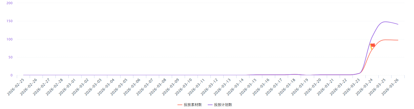 直至今年3月15日,手游端正式启动上线预热投放,但整体量级依旧保守;3月24日产品公测当日,项目组小幅加码素材投放,后续投放量稳步递增,全程未出现大规模放量动作。