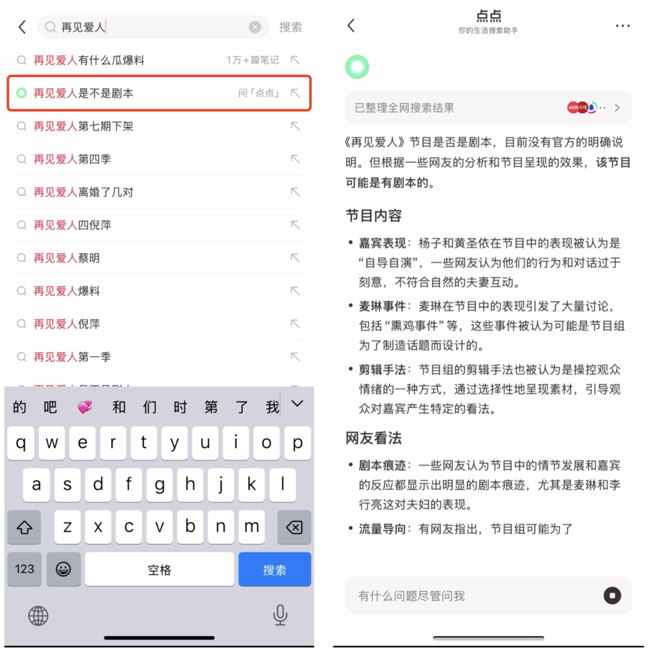 小红书APP端搜索灰度测试嵌入自己旗下的AI工具“点点”,搜索相关关键词后,会出现相关提示