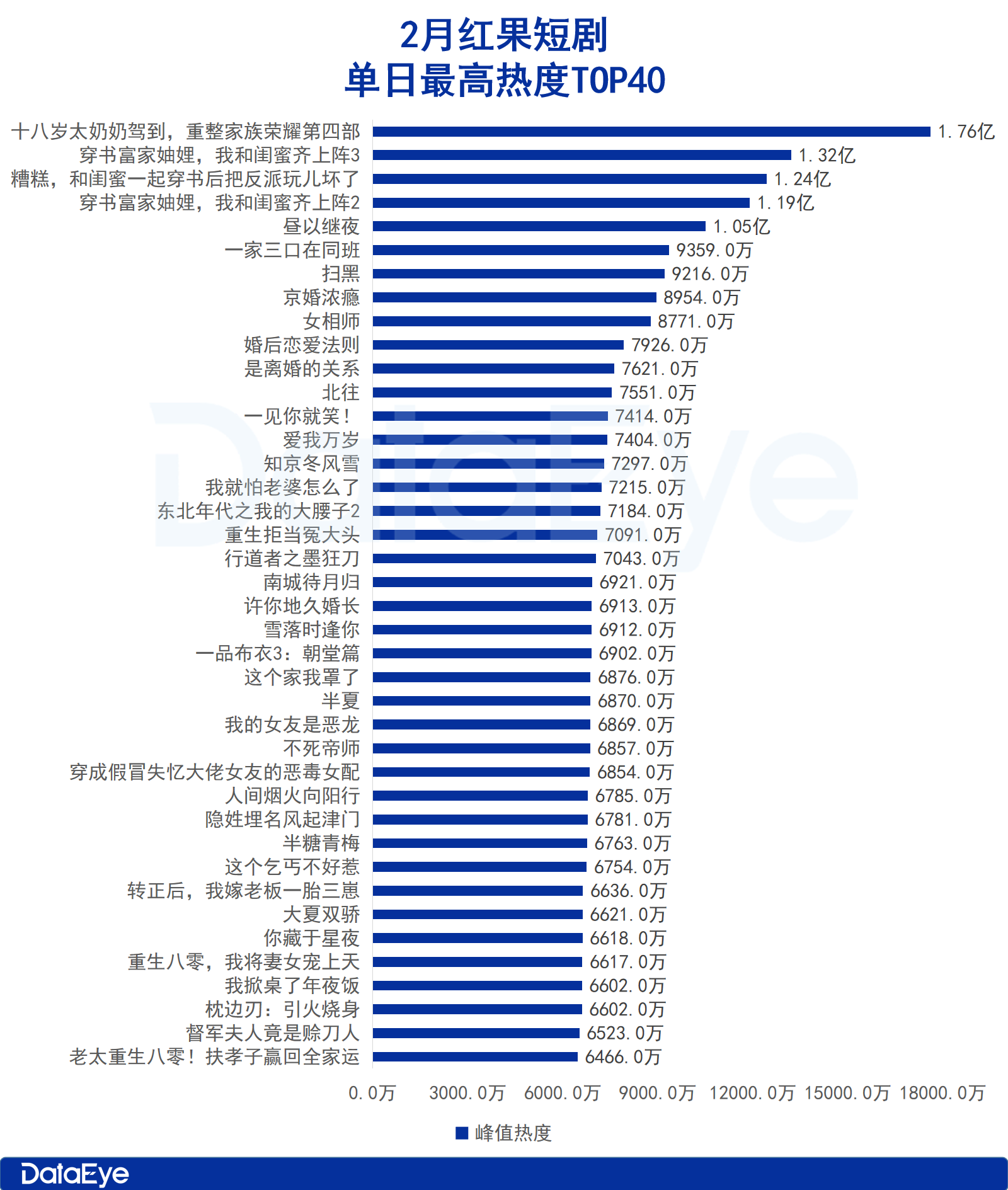 2月上榜的红果短剧中,共有9部微短剧热度峰值超8000W,5部微短剧热度峰值破亿。其中,榜首《十八岁太奶奶驾到,重整家族荣耀第四部》峰值热度达1.76亿,大幅领先。