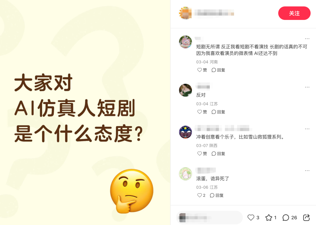 有的网友明确反对AI演员,觉得AI仿真人短剧“诡异”;有的网友表示“冲着创意看个乐子,比如雪山救狐狸系列”;还有网友表示,短剧不看演技,所以用AI仿真人无所谓,但是长剧坚决不接受,因为AI做不到真人演员的微表情。
