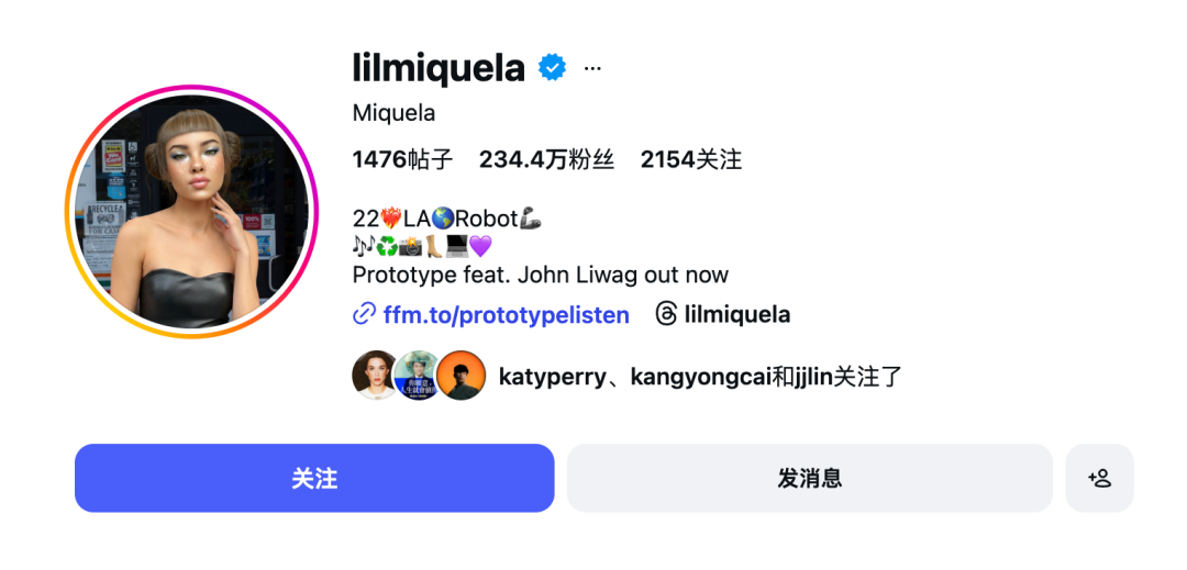 特别是2016年就已上线的虚拟网红标杆案例——Lil Miquela,在外网已经拥有超过700万粉丝,还曾与Prada、Calvin Klein及Samsung等品牌合作拍摄宣传片,登上《Vogue》《TIME》等主流媒体,与蕾哈娜、BTS一同入选“25位最具影响力互联网人物”,其母公司Brud的估值也曾高达1.25亿美元。