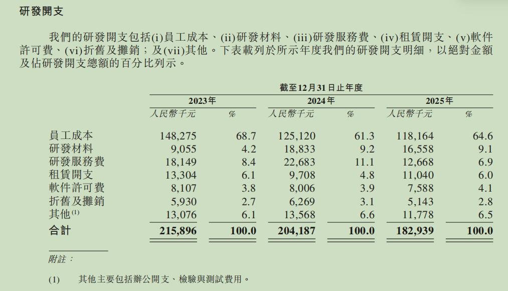 其次就是研发投入跌得最明显。XREAL 2023年至2025年的研发开支分别为2.16亿元、2.04亿元、1.83亿元。XREAL在招股书中表示,研发费用的缩减主要源于“研发周期的进展”。