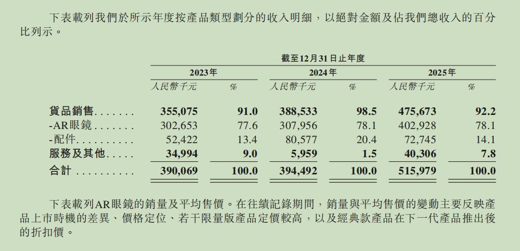 XREAL的收入来自AR眼镜销售、配件销售和技术服务,其中公司九成以上的收入都来自AR眼镜的销售。2025年公司总收入5.16元,其中AR眼镜销售收入4.03亿元。