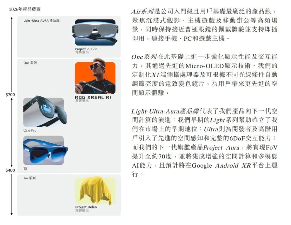 面对2026年的市场机遇,XREAL公布了全产品线矩阵蓝图,包括面向大众市场的普及型眼镜“Project Helen”,与顶级电竞品牌ROG(玩家国度)合作的专业电竞眼镜“R1”,以及和Google(谷歌)共同开发、深度集成空间计算与多模态AI能力的下一代旗舰XR产品“Project Aura”等。