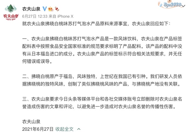 但农夫山泉否认并强调产品标签标示符合相关法规要求,无任何错误或误导。同日,建德市市场监督管理局发布通报称,经核实,农夫山泉拂晓白桃味苏打气泡水的生产原料无从日本福岛县采购的情况。