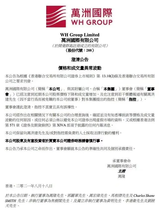 而这只是万洪建对于父亲不满行为的其中一件事情,在这场内斗与公开决裂还在进行时,万洲国际8月18日也发布澄清公告称:万洪建对集团提出的指控不实。并称公司保留向万洪建或对指控需负责的人士采取法律行动的权利。董事会愿就公告的准确性共同及个别承担责任。