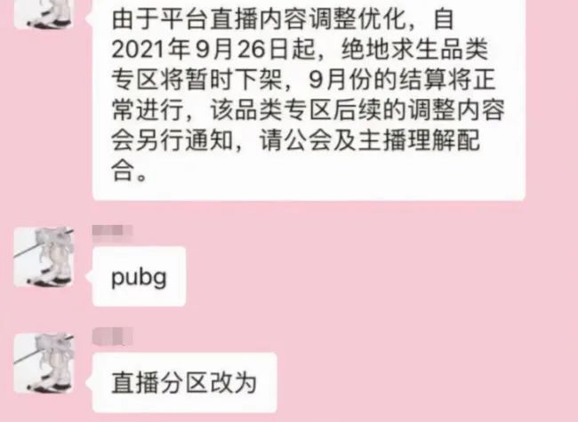 而在这之后,有《绝地求生》主播也晒出了公会运营,在内部群内发布的公告,表示将会下架绝地求生品类的专区,后续开播的时间都没有一个明确的说法,需要主播们进行配合,侧面证实了《绝地求生》将会禁播的消息。