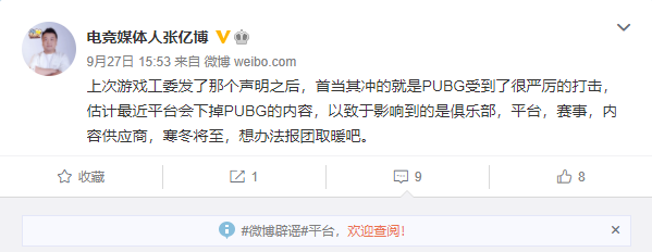 于此同时,微博被认证为“中国文化管理协会电子竞技管理委员会副会长”的电竞媒体人张亿博一发文称:“上次游戏工委发了那个声明之后,首当其冲的就是PUBG受到了很严厉的打击,估计最近平台会下掉PUBG的内容,以致于影响到的是俱乐部,平台,赛事,内容供应商,寒冬将至,想办法报团取暖吧。 ”