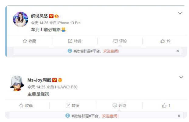 《绝地求生》的解说也几乎在同一时间发出了微博,解说风筝:“车到山前必有路。”joy周毅则发文说:“主要是怪我”。不过两人目前已经把推文删除,只有风筝在清理《绝地求生》的周边送给粉丝。