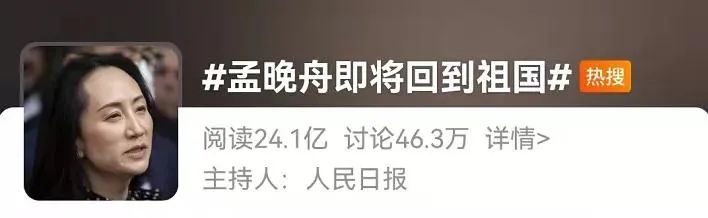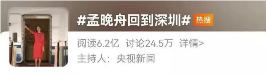 前几天,孟晚舟回国消息在各大平台刷屏,#孟晚盘即将回祖国#孟晚舟回深圳#等话题爆了,话题总流量高达几十亿,仅微博热搜上孟晚舟回国的消息上了22条热搜。
