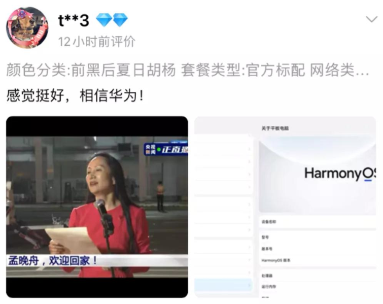 一位网友很有心,打开刚收到的鸿蒙系统平板电脑,打开孟晚舟回家直播节目,拍下直播画面,晒在评论区:“感觉挺好,相信华为!”