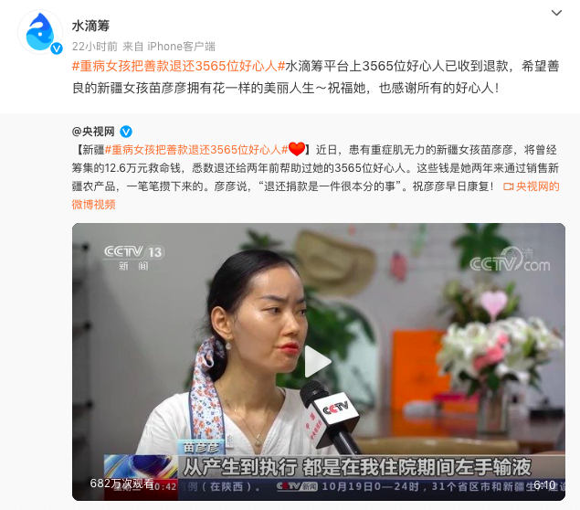 事情是这样的:2019年,重症肌无力患者苗彦彦通过水滴筹,获得3565位好心人捐款,共筹得126482元。经过了五次病危,最终苗彦彦战胜了病魔。而一出院,苗彦彦就投入了工作挣钱。2021年8月9日,苗彦彦申请了水滴筹126482元全额退款,将3565位捐款者的钱全部退还。