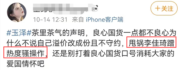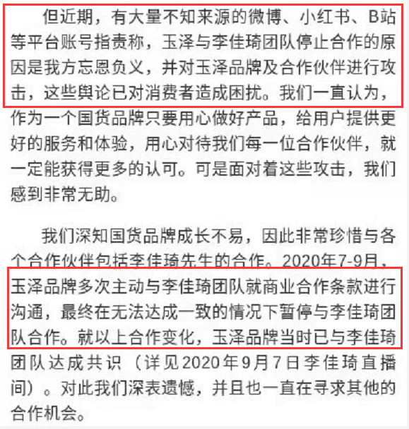 玉泽10月中旬微博突然发了条声明,提及玉泽一年前未能与李佳琦方达成商业合作,最近招来网友指责玉泽“忘恩负义”。
