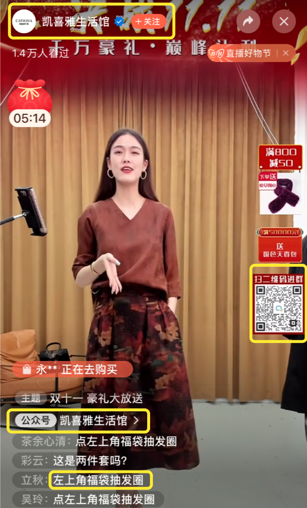 和一般直播间都会放一两款“秒杀价”的产品或者直播间卖爆的“镇店之宝”不同,秋秋还发现,视频号的直播间,产品的价格都不低,商家通常会强调“款式”。尤其是视频号直播上很多与真丝、羊绒有关的商品,主播一般会告诉观众,这一款只有自己家能做,或者“全年只有双11有这个折扣”。