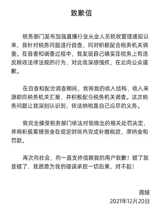 当然,薇娅第一时间回应称“深表愧疚,将在规定时间补缴税款、滞纳金和罚款”。随后,薇娅的淘宝店铺被关停,包括微博、抖音、视频号等主要社交账号被封。“淘宝直播一姐”彻底在网络上消失。