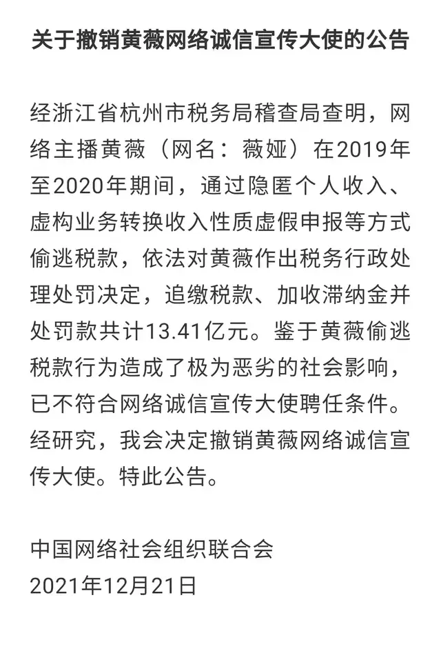 不过就在稿子发布之前,中国网络社会组织联合会宣布了撤销黄薇(薇娅原名)网络诚信宣传大使的消息。